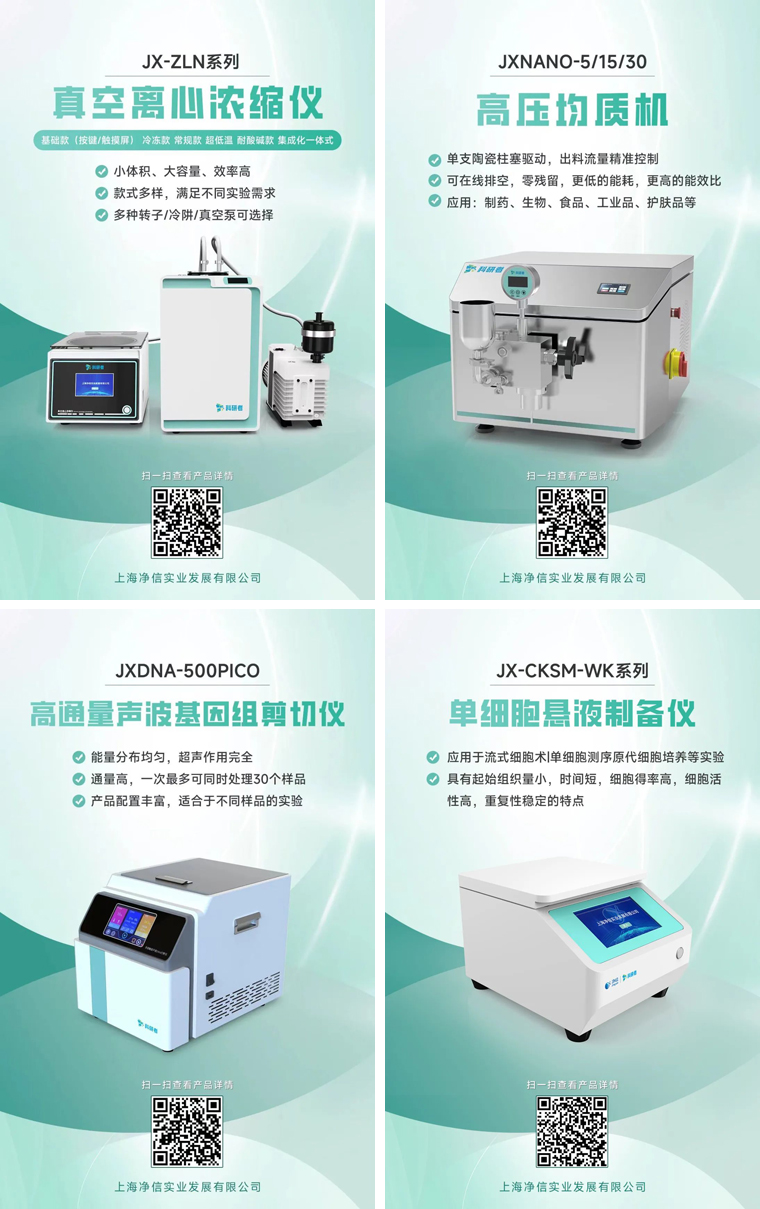 十幾年來凈信不斷進行自我創(chuàng)新與突破。通過持續(xù)優(yōu)化產(chǎn)品性能和提升服務質量,我們實現(xiàn)了從單一產(chǎn)品到多元化發(fā)展的轉變,拓展了市場影響力。上海凈信科研者系列產(chǎn)品也在上市推廣中!真空離心濃縮儀、高壓均質機、單細胞懸液儀、高通量聲波基因組剪切儀。
