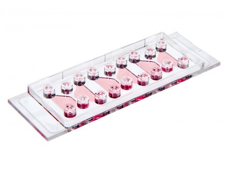 搭配微量分注器使用于兩側(cè)60 μL儲(chǔ)液槽中制造出化學(xué)物質(zhì)的線性濃度梯度,此時(shí)嵌入在儲(chǔ)液槽中間觀察管道基質(zhì)膠中的細(xì)胞即處于一穩(wěn)定的線性濃度梯度培養(yǎng)環(huán)境中。