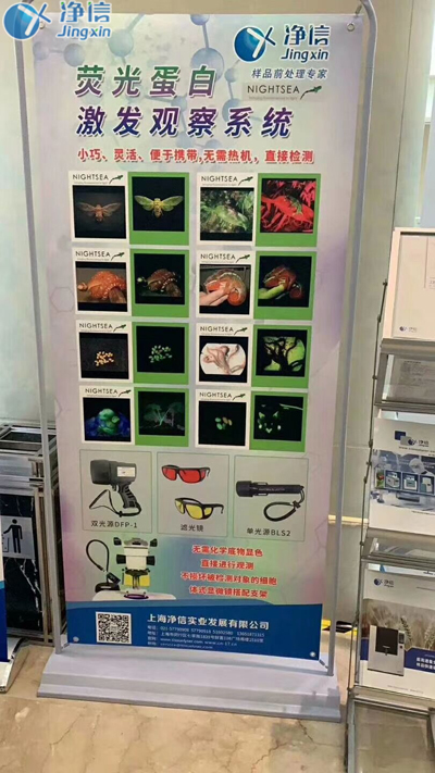 同時,在此次展會上,上海凈信還推出了一款沉淀已久的新產(chǎn)品—美國NightSea熒光蛋白激發(fā)觀察系統(tǒng),這是一款無需化學(xué)底物顯色,直接進(jìn)行觀測,不損壞被檢測對象細(xì)胞的設(shè)備,擁有小巧、靈活、易攜帶、使用簡便等優(yōu)點(diǎn),對于有轉(zhuǎn)基因?qū)嶒炐枨蟮目蒲腥藛T,是一種特別“對胃口”的產(chǎn)品;其原理是發(fā)出的特種光源照射至生物表面時,佩戴專用濾光鏡(過濾掉大部分反射光只保留所需要的光源);便可實時觀察生物的基因變化狀態(tài),目前分為單光源和雙光源兩種型號。